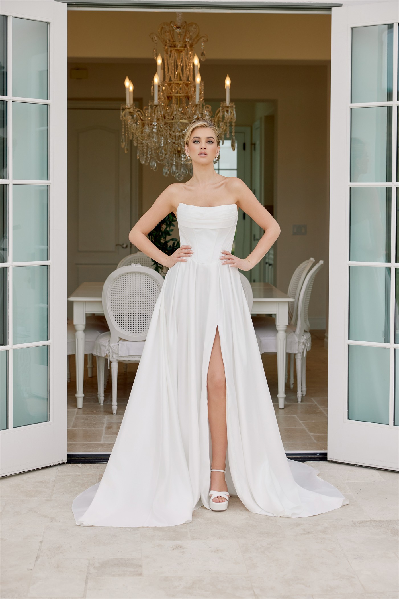 Description: SATIN A LINE GOWN WITH A STRAPLESS NECKLINE AND BONED BODICE FOR A FITTED SILHOUETTE PLEATED SKIRT ADDS SOFT VOLUME TO THE DESIGN THIS GOWN IS AN IDEAL CHOICE FOR THE MODERN BRIDE